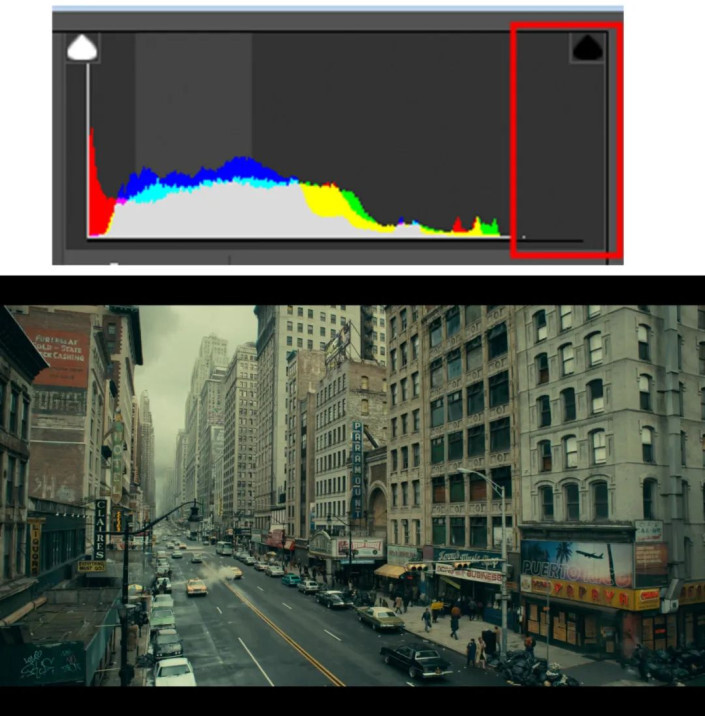 这种电影色调整个画面调子很暗,尤其在画面的白色亮部区域很少,这一点大家也可以通过对照片直方图http://www.yuucn.com/tags/32438/对分析得到:直方图的白色信息没有。