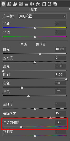 然后小曼又降低了黑色工具和提升了去除薄雾工具,这两个工具都是给画面加入黑色的,因为之前的亮度调整可能会让画面的灰色变多、黑色变少,所以加入黑色。