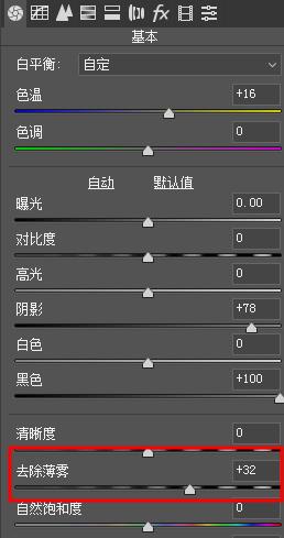 然后我们稍微去增加去除薄雾工具,减少一点灰色。