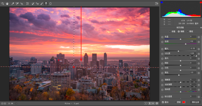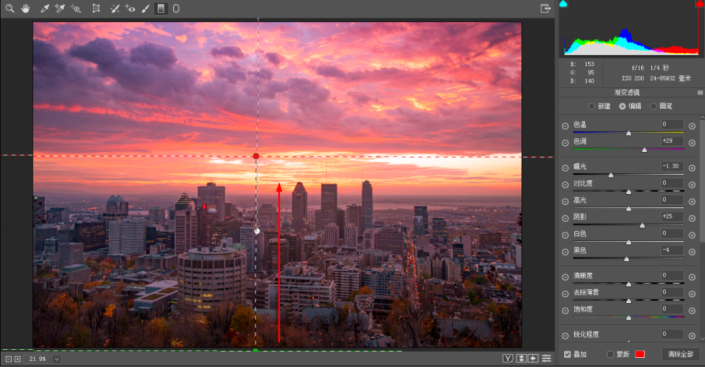 第二个局部调整:对下面建筑进行单独调整,拉一个渐变滤镜。