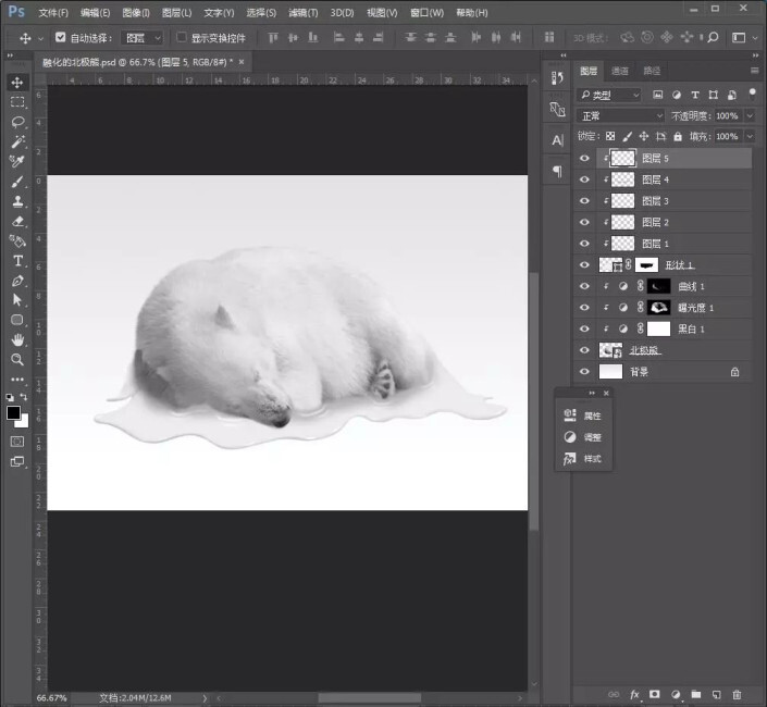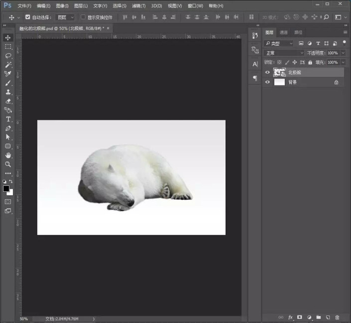 1.打开【PS】,新建任意画布大小,填充背景为灰白色,拖入北极熊素材,放置场景中心。