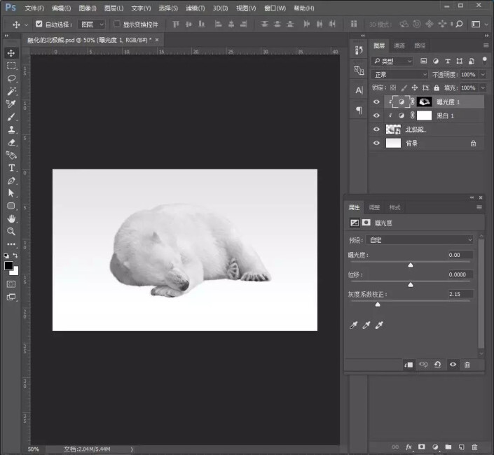 3.添加【曝光度】调整图层,创建剪贴蒙版http://www.yuucn.com/tags/38848/,并把蒙版填充为黑色,使用白色画笔把北极熊的暗部涂亮。