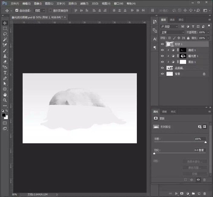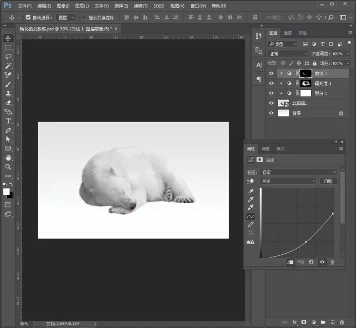 4.添加【曲线】调整图层,创建剪贴蒙版,填充蒙版为黑色,并涂抹出北极熊的阴影暗部部分。