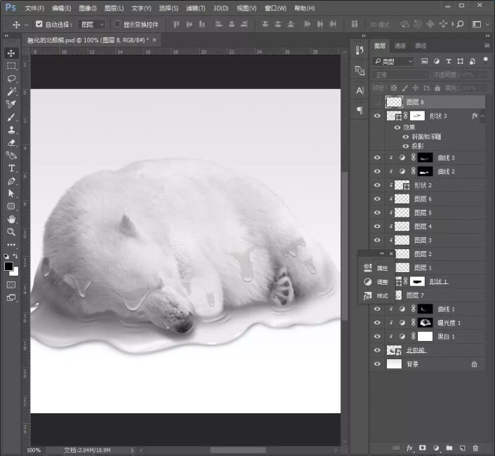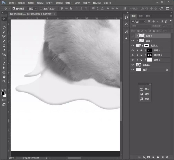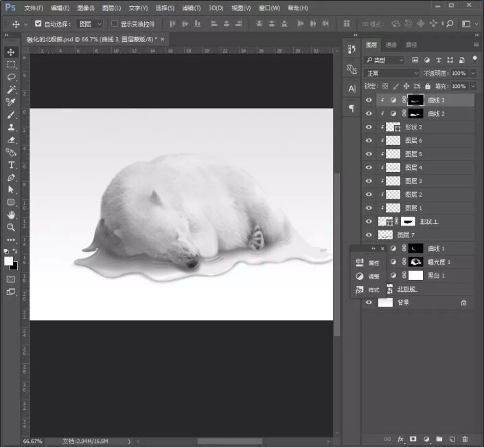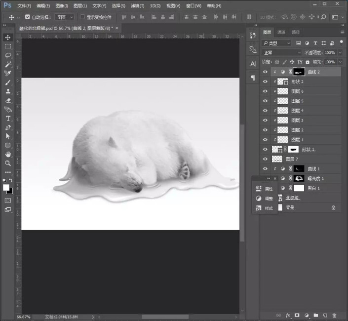 15.再添加【曲线】调整图层,压暗北极熊,创建剪贴蒙版,填充蒙版颜色为黑色,使用白色画笔涂抹北极熊接触液体位置的暗部。