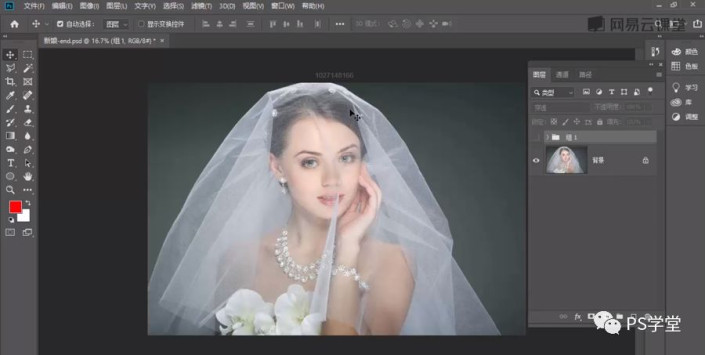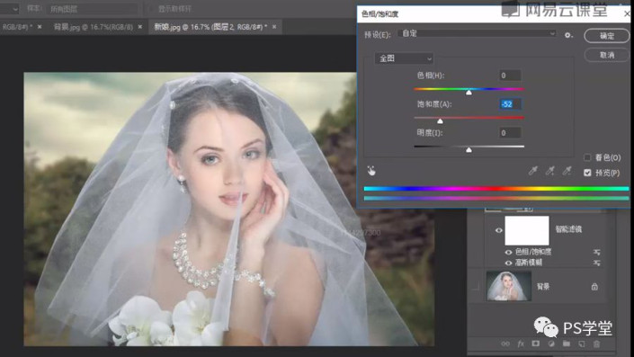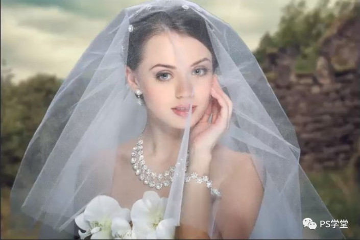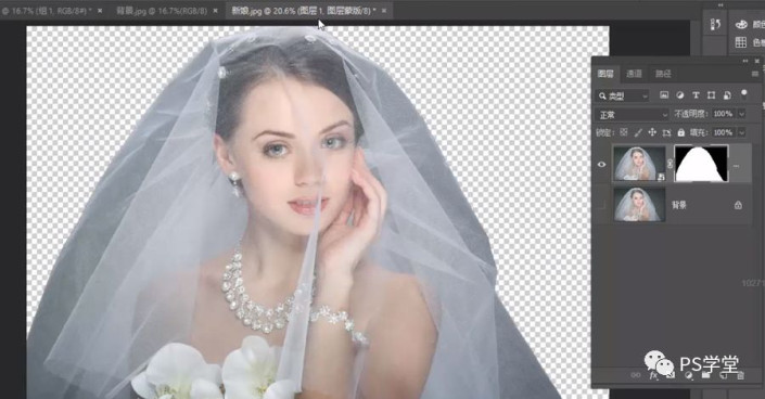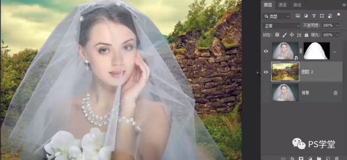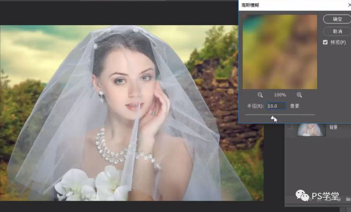 可以看到婚纱的半透效果就出来了,不过整体还是有点不和谐,其实是因为两个元素色彩饱和度不同,我们先调整一下背景的清晰度,这里使用到的是高斯模糊。
