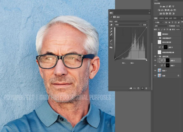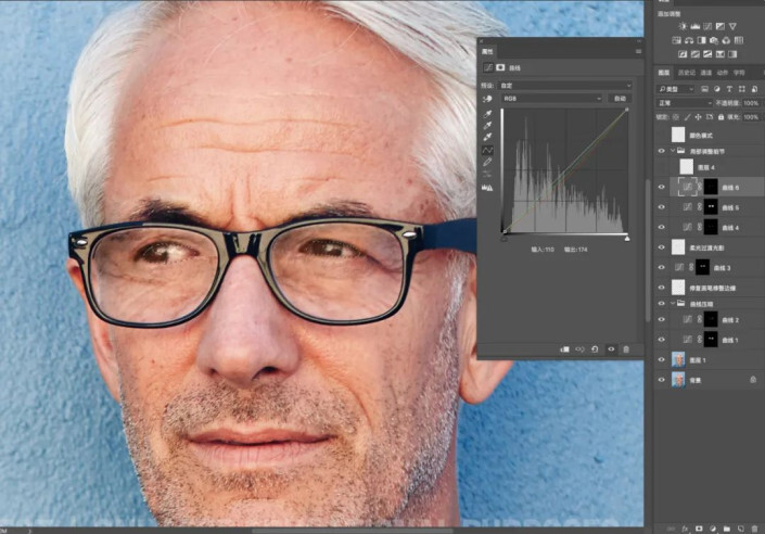 我们刚才说了灰色深浅不一,所以不可能一次就压到位,要多压几次。再选中我们上一步中,没有压到位的灰色区域,执行曲线压暗,直到灰色区域跟皮肤融合