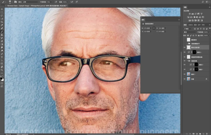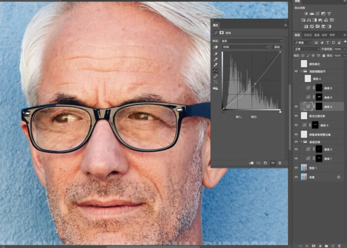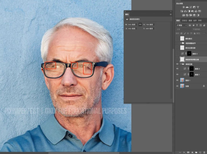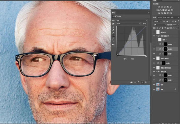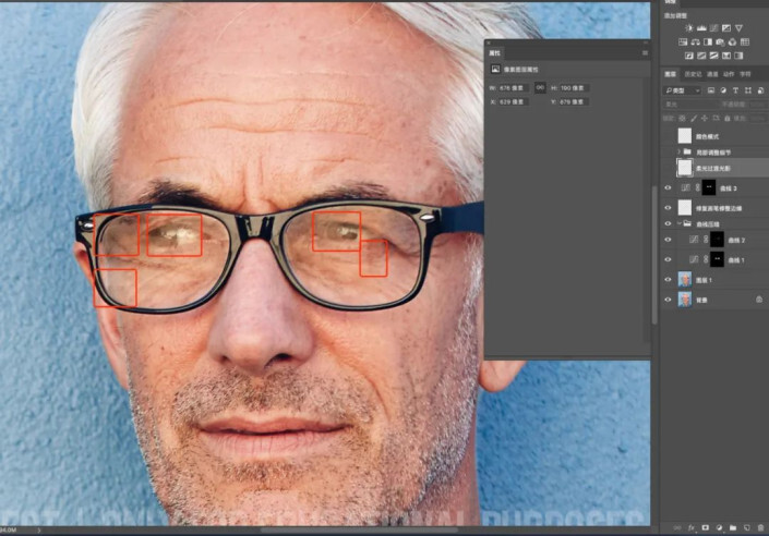 眼镜上有反光,我们可以理解为反光处为灰色区域,,但灰色区域深浅不一,还有比较实的边。我们第一步先处理灰色区域,先选中灰色区域,适当曲线压暗(我这里使用的是快速蒙版http://www.yuucn.com/tags/38847/)