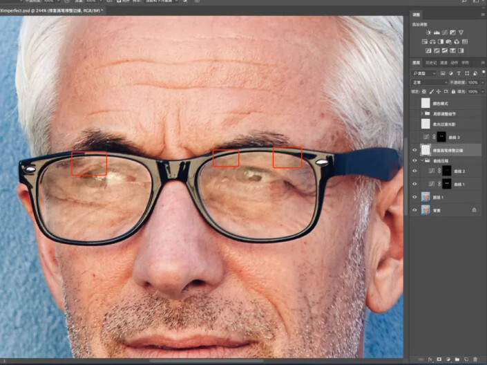 先用修复画笔修复白边,眼眶边缘的白边要用到仿制图章,因为修复画笔会糊。
