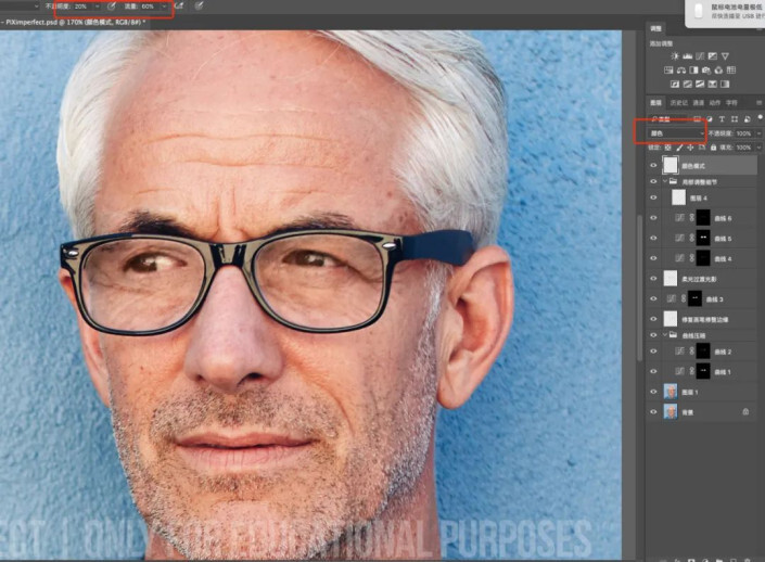 最后用颜色模式均匀一下色块就可以了。吸管吸取正常的肤色,20%的不透明度60%的流量,画笔工具涂抹颜色不匀的色块。