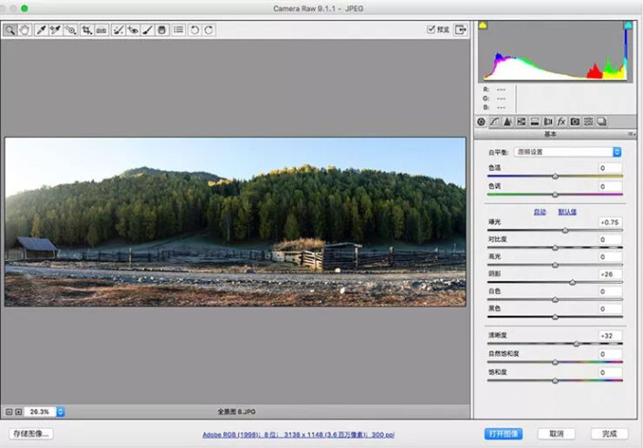 1,ACR处理。用PS打开RAW格式文件时,先会被ACR打开。在ACR右边默认的设置面板里,调节曝光(+0.75)、阴影(+26)、清晰度(+32)。这一步的目的是拉开画面明暗层次和对比。调节完了之后,点击ACR右下角的“打开图像”,进入PS界面。