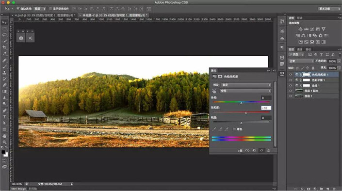 如果所有的树全是绿色,会让人觉得颜色有点单调,没有层次感,可以增加一点树木黄色尖尖的饱和度(+18),增加色彩跳跃度。