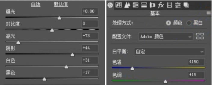 打开原图进入ACR,在基本面板进行第一步的处理:增加曝光,提亮画面收高光,提阴影保留细节提白色,收黑色控制光感提一点色温增加皮肤的暖调氛围