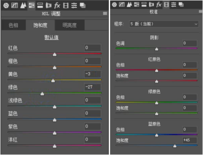 ① 进入HSL面板,通过控制黄色和绿色的饱和度,来调整树叶的颜色。树叶的颜色切忌调得非常偏青哦,不然会显得很假。