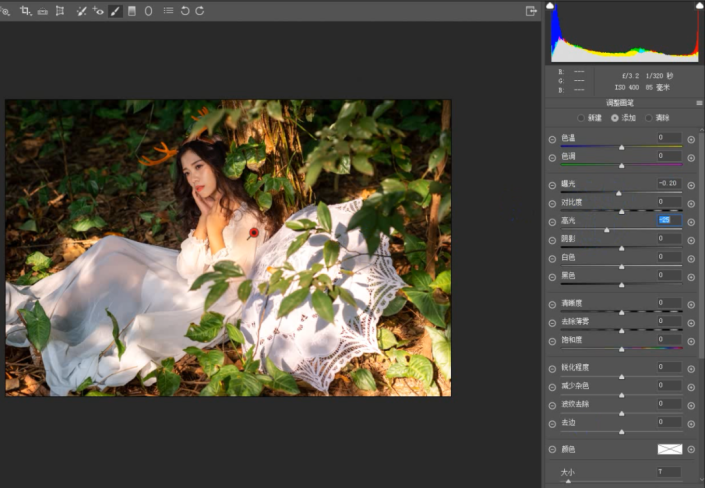 ③ 选择上方工具栏中的画笔工具,设置好相关参数后,对画面中如白裙子、白伞等过白过亮、刺眼的地方进行涂抹。