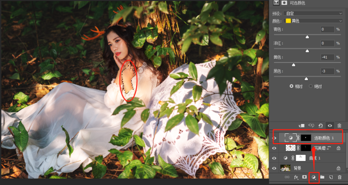 手背发黄,建立选区选中手背,添加可选颜色图层减淡黄色。