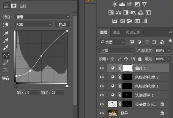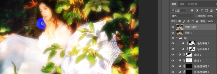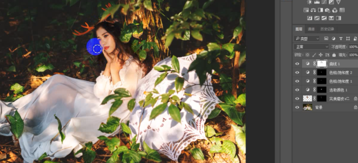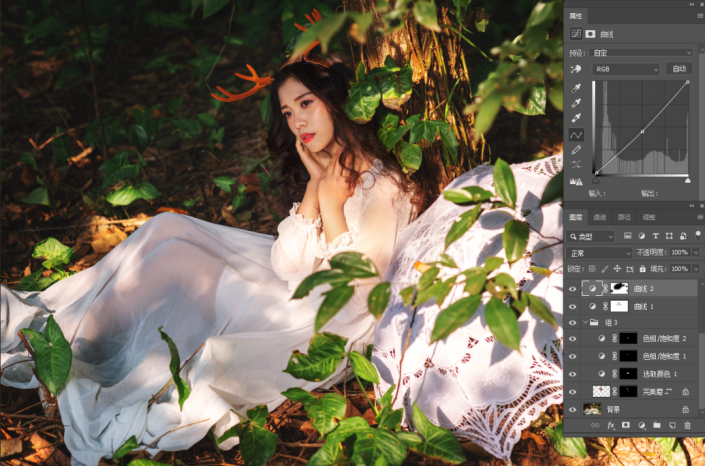 周围树叶部分的光影太过强烈,建立曲线图层添加暗角效果弱化对比,随之一起变灰的人物头发部分则用画笔在蒙版http://www.yuucn.com/tags/38847/上擦回原色。