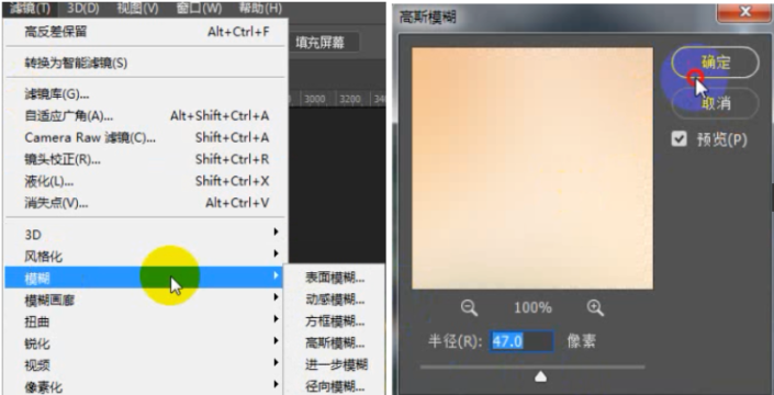 在滤镜中选择高斯模糊,半径设置为50左右,图层混合模式设为柔光,再复制一个图层,混合模式设为滤色,将两个图层的不透明度都调整为50%左右。