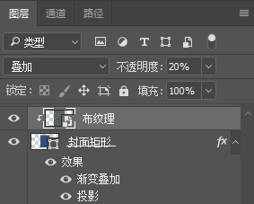 3.接着我们把素材的布纹理拉入到画布中,剪切蒙版http://www.yuucn.com/tags/38847/到封面矩形上,混合模式为叠加,调整混合模式为叠加,不透明度20%。(一个封面的材质感觉就出来了)
