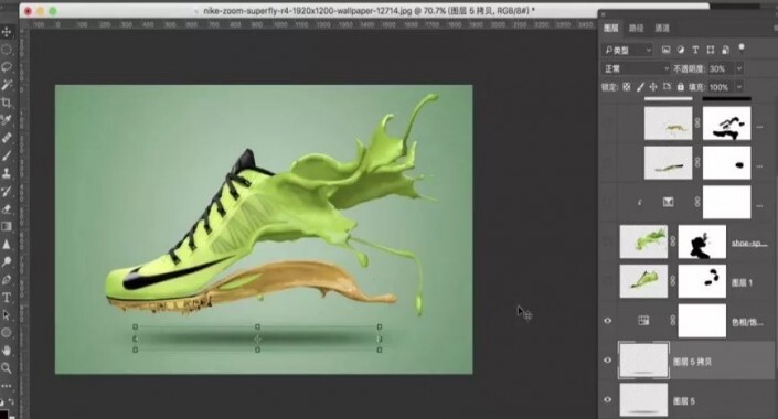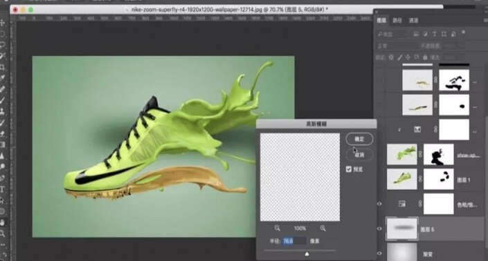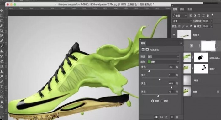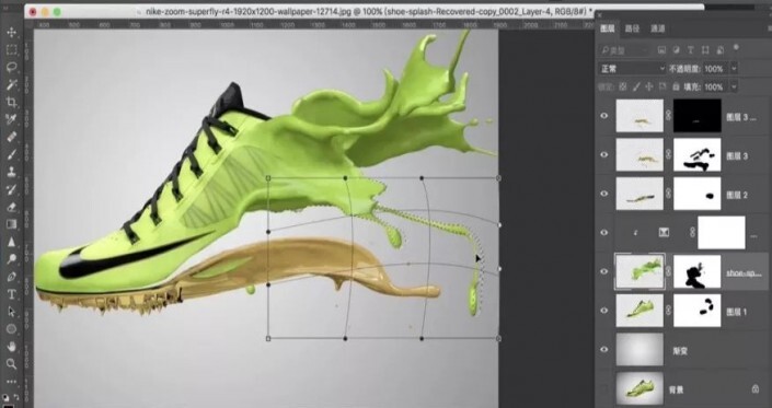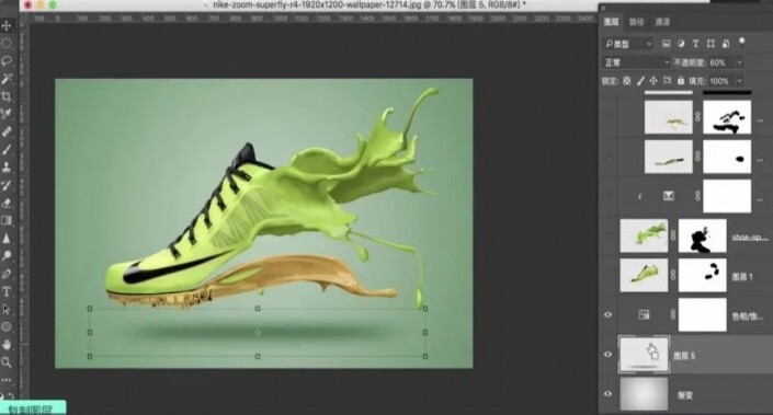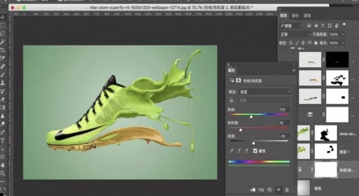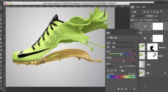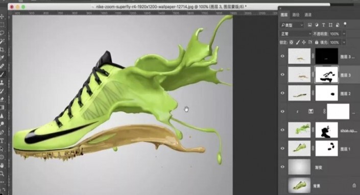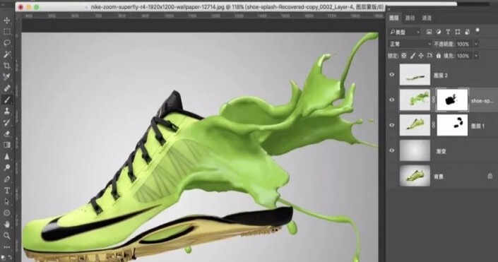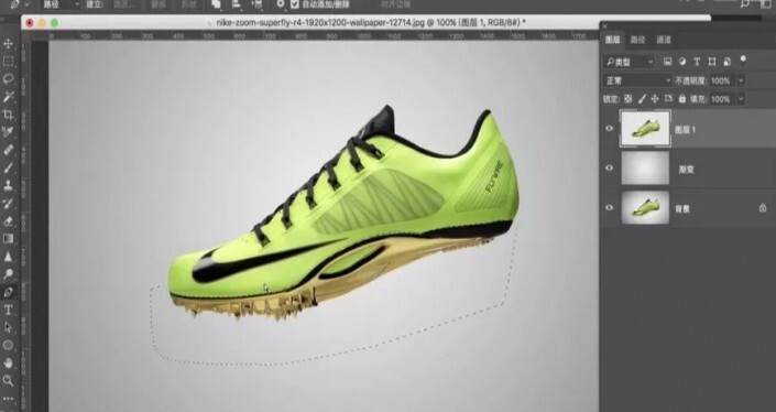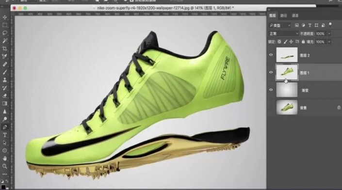 1.打开鞋子素材并进行抠图,新建图层命名为渐变,图层图示渐变,再用钢笔工具按细节分别扣出来;