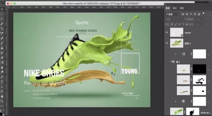 3.导入油漆素材调整位置大小,在对应图层创建图层蒙版http://www.yuucn.com/tags/38847/并用低不透明度的柔角画笔擦拭融合,效果如图示;
