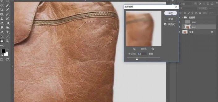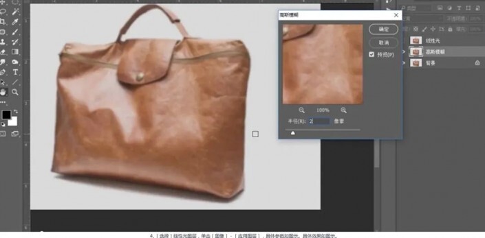 4、[图层模式]线性光,[选择]关联图层,按[Ctrl+G]编组,[重命名]图组。[选择]高斯模糊图层,使用[涂抹工具]涂抹皮具纹理细节。使用[套索工具]套选修改区域,单击[滤镜]-[模糊]-[高斯模糊],具体参数如图示。具体效果如图示。