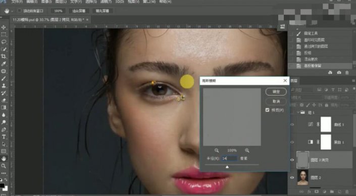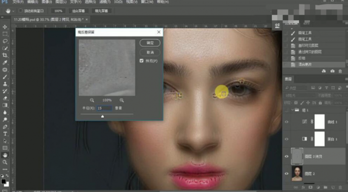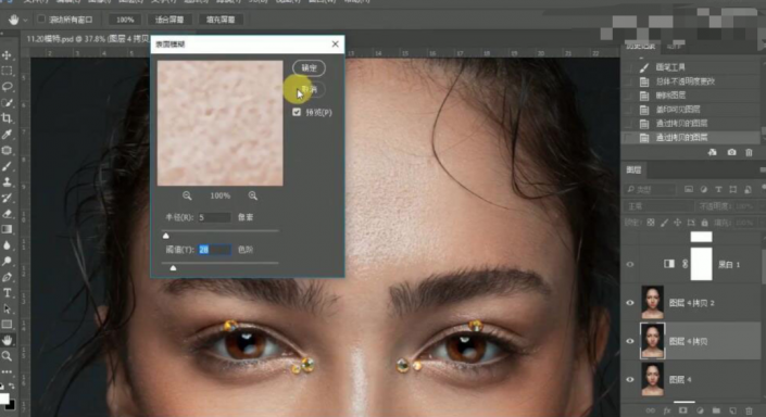 30、按【Ctrl+Shift+Alt+E】盖印图层,【复制】2次图层。【选择】中间图层,单击【滤镜】-【模糊】-【表面模糊】,具体参数如图示。具体效果如图示。