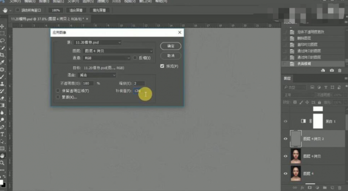 31、【选择】顶层盖印图层,单击【图像】-【应用图像】,具体参数如图示。具体效果如图示。