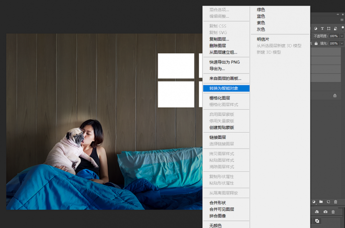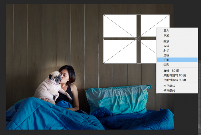 9、shift键进行四个图层的选中,右键把他们转化为智能对象http://www.yuucn.com/tags/34209/。然后按住ctrl t进行变形,右键选择一个扭曲。按住ctrl键选择右上角的点,让它稍微的斜一点。
