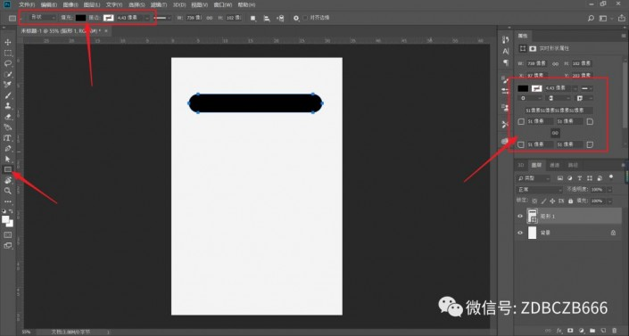 选择矩形工具,绘制如图所示的矩形。在属性栏中,将矩形更改为圆角,如图所示: