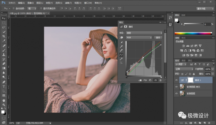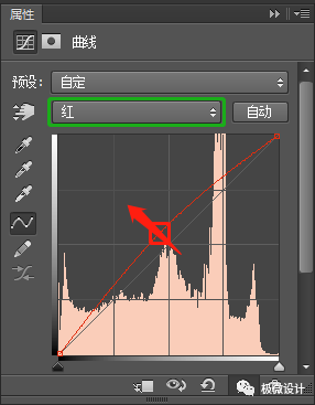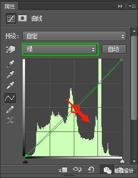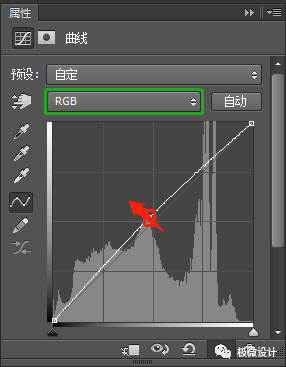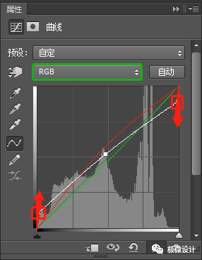 最后,按照下图所例,调整(RGB)曲线标点的两端,使其减少对比度