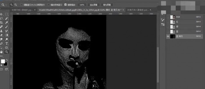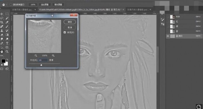 4、【Ctrl+J】复制图层,命名为磨皮,复制蓝色通道,通常对于皮肤的脏东西比较明显,使用【高反差保留】调整,使用【应用图像】调整,选择叠加,反复3次使更明显,最后一遍选择线性减淡(添加),把小细节都拿出来。