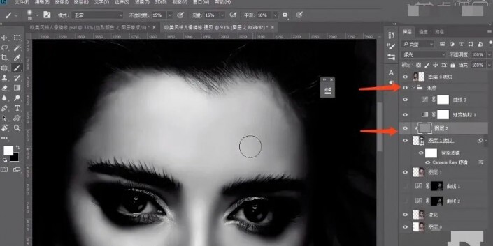 8.新建中性灰图层(新建图层,填充50%中性灰),创建剪贴蒙板,画笔大小和流量改为15%,最好新建观察组,便于观察(新建黑白,曲线),把脸上坑坑洼洼修平,亮的涂亮,暗的涂暗。