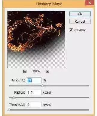 把选区复制粘贴到我们的文档,使用下面usm锐化来稍微锐化一下火焰: