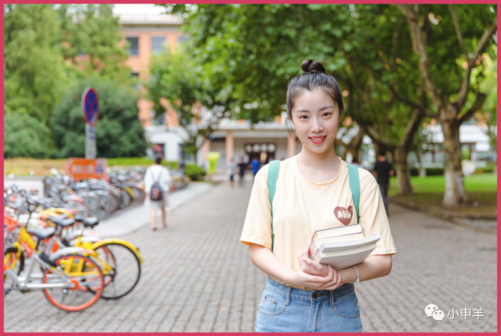 (1)这是一张校园内的人像摄影图,主体对象是一位漂亮小姐姐,背景则是大学校园,有虚化;