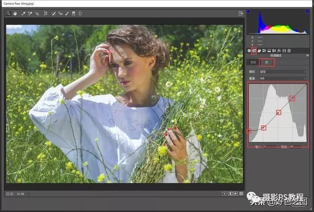 接下来为照片的暗部区域增加灰度,进入"曲线"面板,还是老一套,高光、中间调、暗部用三个节点锁定,向上拉动最下面的暗部节点,已达到暗部增加灰度的作用: