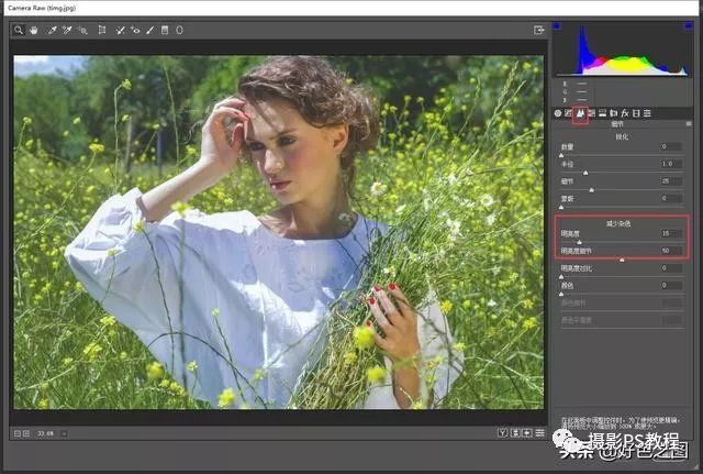 现在可以看到,人物头发的暗部以及身后树林的黑色区域,灰度都有所增加。继续下一步,点击"细节"面板,将"减少杂色"的明亮度增加一些,去除照片中的噪点: