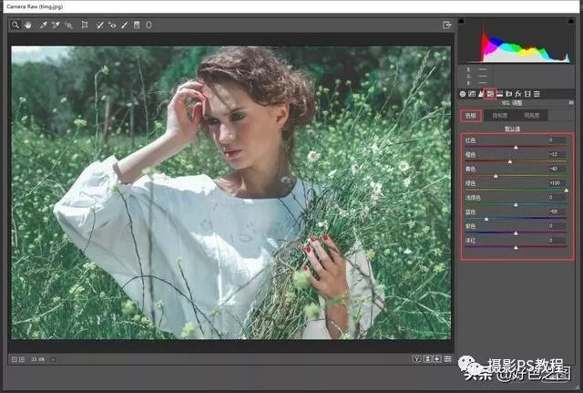 刚才的操作中,将色温调高,稍微偏向蓝色一些,色相上针对人物肤色,增加了一点点洋红。降低曝光度,大幅度减少高光,提亮阴影,稍微调整黑色和白色,目的是降低照片的明暗反差。降低一点自然饱和度,同时针对颜色整体增加饱和度。
