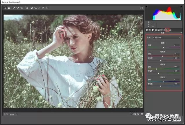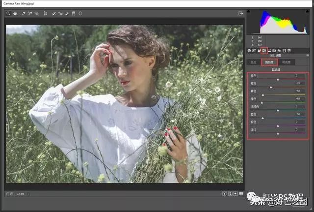 接下来就开始调整颜色了,点击"HSL"面板,先来调整饱和度,,降低橙色、黄色、绿色、蓝色的饱和度,使照片颜色变的淡一些: