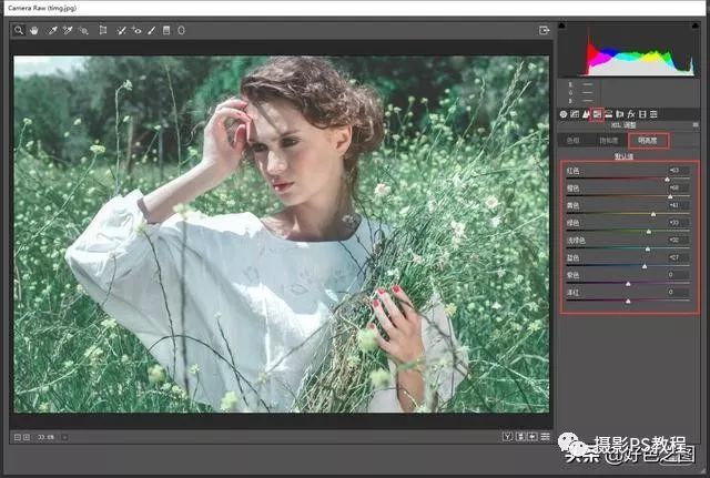 下一步来调整各种颜色的"明亮度",将照片中所包含的各种颜色全部加亮,进一步降低颜色的明暗反差: