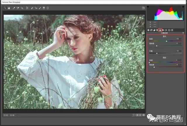 好了,现在我们来给照片整体定义色调,进入"分离色调"面板,调整高光色相至青色,增加一点饱和度,暗部色相设置为红色,增加饱和度。平衡偏向暗部(平衡的作用是高光色调和阴影色调的比例):