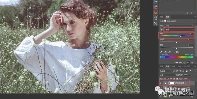 新建"色相饱和度"调整图层,选择"青色",将色相向蓝色偏移,让人物衣服上的青色偏向蓝色,目的是与周围的草地颜色上有所区别: