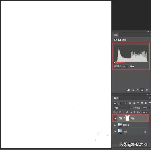 到这里,小伙伴们思考一下,刚才调的是左边,画面全白了,现在拖到最右边,是不是就是全黑?。我们接下来要做的,就是用同样的方法,在画面中找到最亮的地方,进行颜色取样。