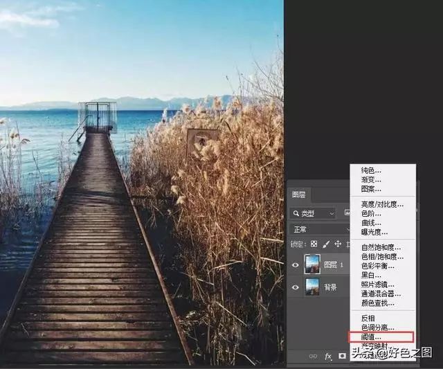 在PS中先打开图1这张背景照片,CTRL+J复制一个图层,接下来,我们要快速的将背景中阴影、高光、和中间调取样出来,点击图层面板中的新建调整图层按钮,选择"阈值",新技能哦,留心看。