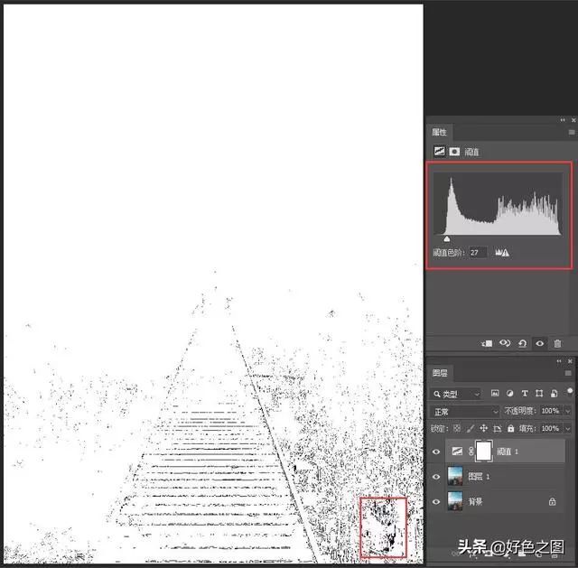 建立好了阈值调整图层后,属性面板中就会出现阈值调节滑块。先将调节滑块移动到最左边,这时照片内容就会变成纯白色: