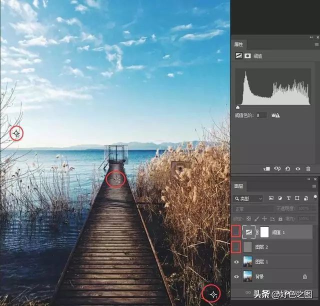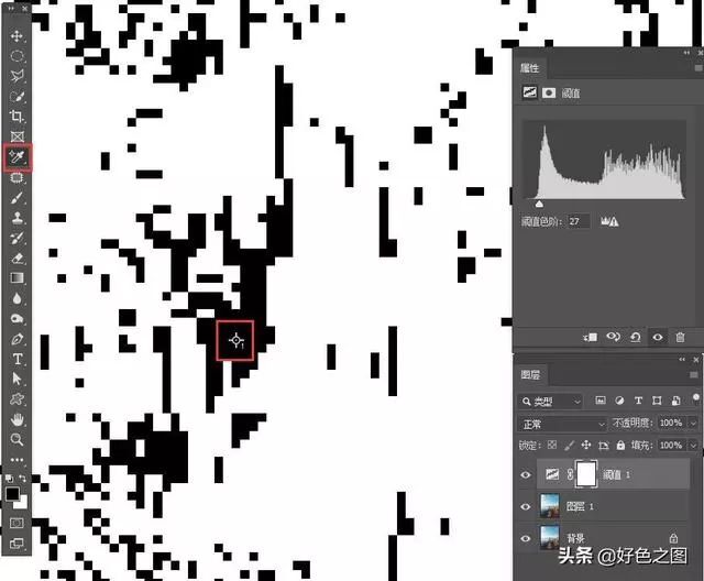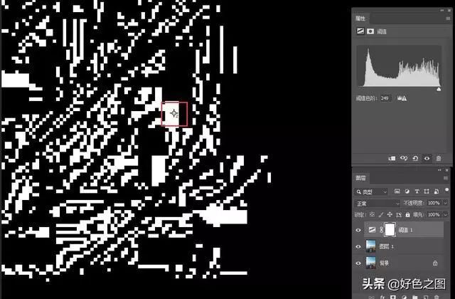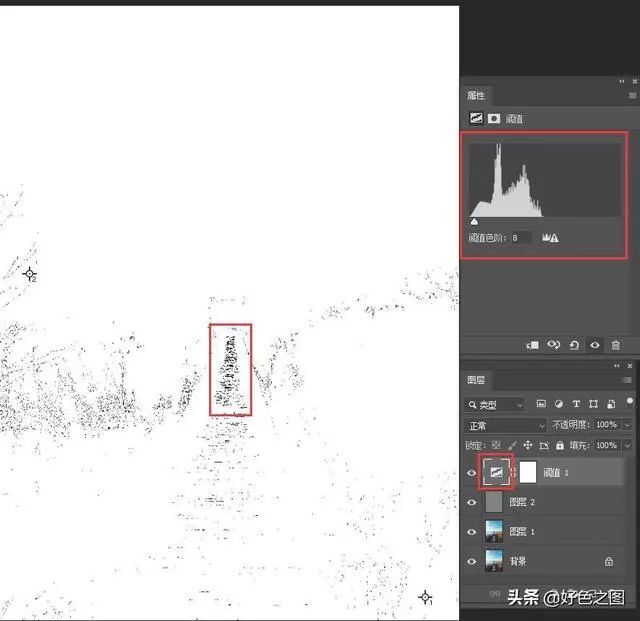 现在我们需要验证一下,看看我们刚才做的取样是否精准,到底是不是图片中最黑和最白的区域。使用使用快捷键CTRL+0,将图片恢复到默认大小,关闭阈值图层前方的眼睛图标,看看取样的位置分别在哪里: