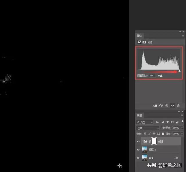 现在,画面中最黑的位置,已经被我们做好了颜色取样。使用快捷键CTRL+数字0,可以把图片恢复到默认大小。接下来,我们将阈值滑块向右调整,拖到最右边,照片又变成几乎全黑色: