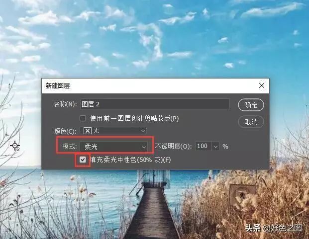 使用快捷键CTRL+SHIFT+N,新建图层,在弹出的窗口中,将点击模式菜单,将图层模式修改为"柔光",并且把下方的"填充柔光中性色"前面打勾。这一步,就是建立了一个中性灰http://www.yuucn.com/tags/38464/图层: