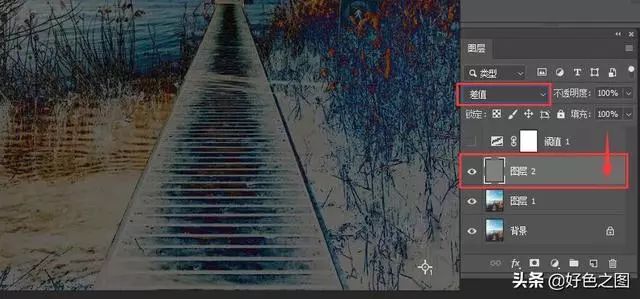 点击确定后,图层面板上就会多出来一个灰色的图层,鼠标左键按住灰色图层向下方拖动,把它放在阈值图层的下方,再将图层混合模式修改为"差值":