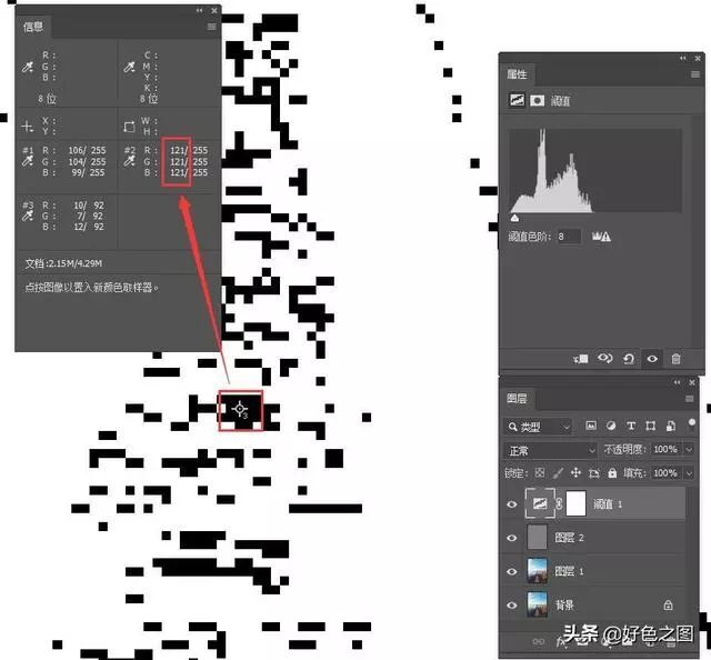 现在就可以把图片缩放到默认大小,将阈值图层和灰色图层前面的预览眼睛关掉,再看看画面上的三个取样点: