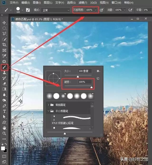 使用快捷键B,切换到画笔工具,右键点击图片,在弹出的画笔设置中,将画笔硬度设置为100%,上方的设置栏中,将画笔不透明度也同样设置为100%: